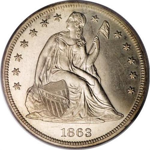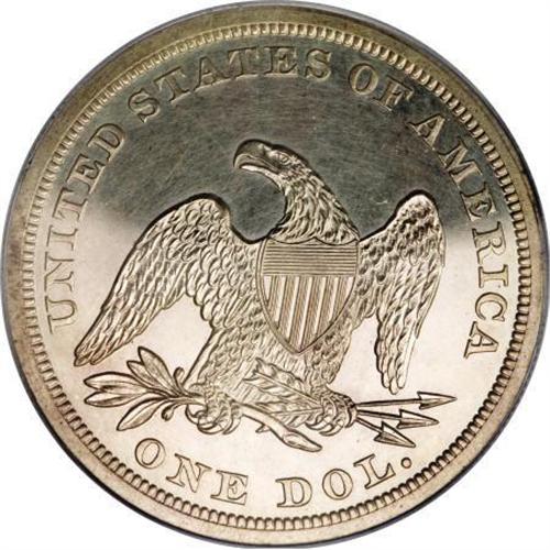 <B>1863 $1 PR63 PCGS.</B></I> Only 460 proofs were struck for this challenging No Motto date. A well struck specimen with light apricot toning and subdued, faintly hairlined fields. A loupe reveals a few tiny obverse mint-made lintmarks. LIBERTY and the obverse shield lines are lightly die doubled. Population: 44 in 63, 48 finer (1/08).<BR><BR><B>Coin Engraver:</B> Christian Gobrecht<BR><BR><b>Shipping:</b> Coins & Currency (<a target="_blank" href="http://www.heritageauctions.com/common/shipping.php">view shipping information</a>)