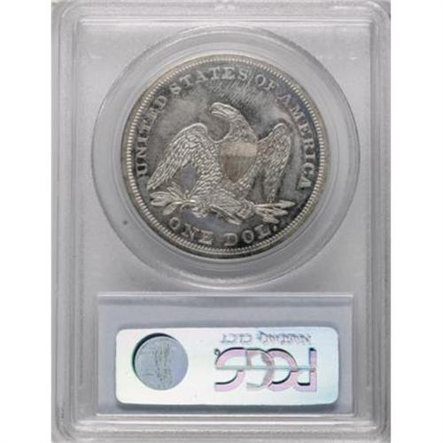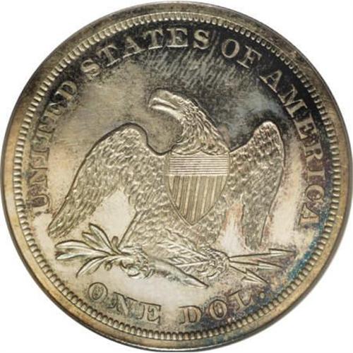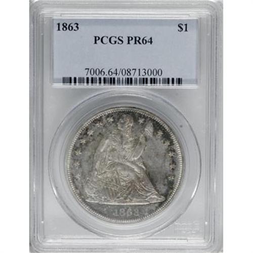 <B>1863 $1 PR64 PCGS.</B></I> Dappled electric-blue, honey-gold, peach, slate, and lime-green toning blankets this exquisitely struck and unblemished specimen. Liberty's left (facing) shoulder is minutely granular. A mere 460 proofs were struck for this Civil War date. Population: 37 in 64, 11 finer (6/07).<BR><BR><B>Coin Engraver:</B> Christian Gobrecht<BR><BR><b>Shipping:</b> Coins & Currency (<a target="_blank" href="http://www.heritageauctions.com/common/shipping.php">view shipping information</a>\)
