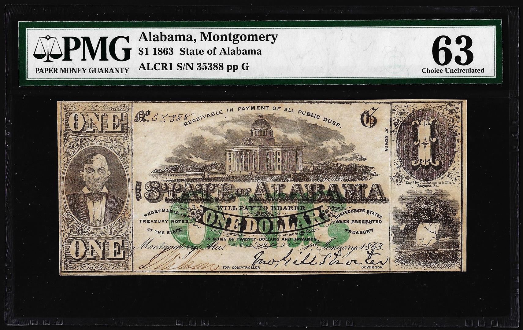 One 1863 $1 State of Alabama Montgomery Obsolete Note PMG Choice Uncirculated 63. PMG Certified.