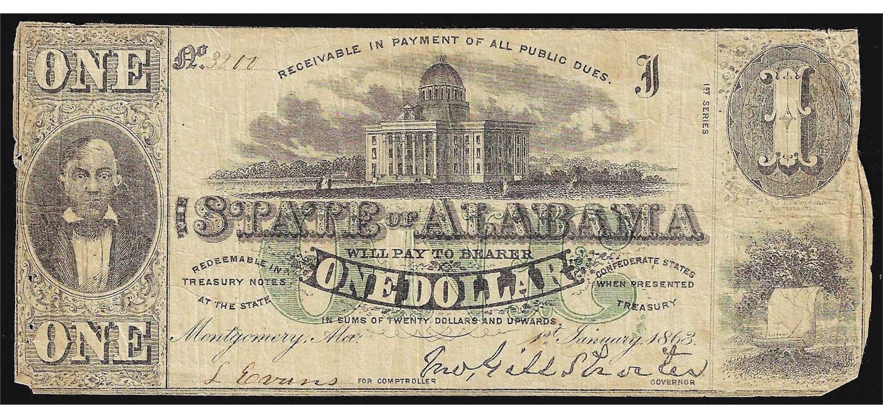 One 1863 $1 State of Alabama Obsolete Bank Note.
