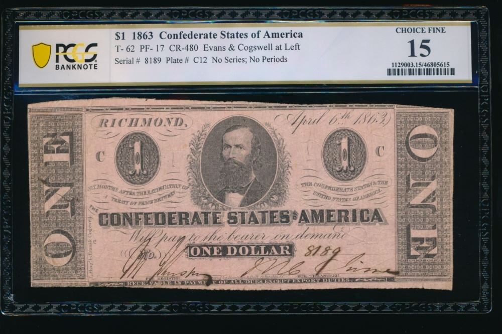 One 1863 $1 T-62 Confederate PCGS 15.