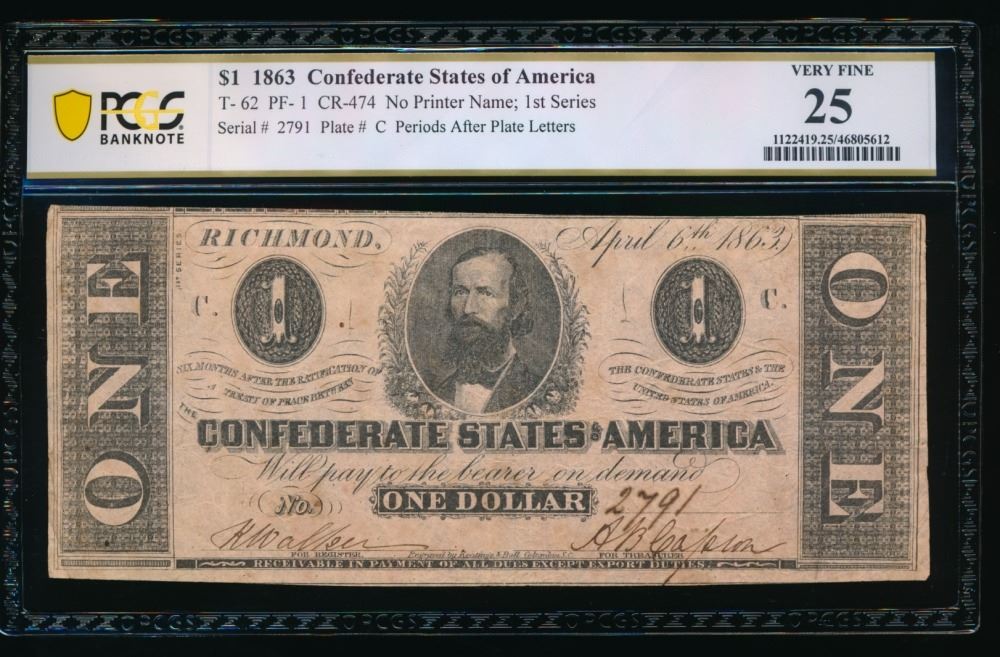 One 1863 $1 T-62 Confederate PCGS 25.