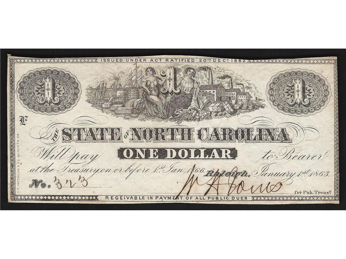 One 1863 $1 The State of North Carolina Obsolete Bank Note.