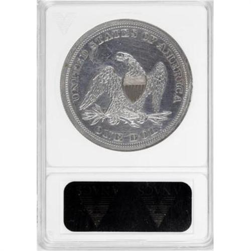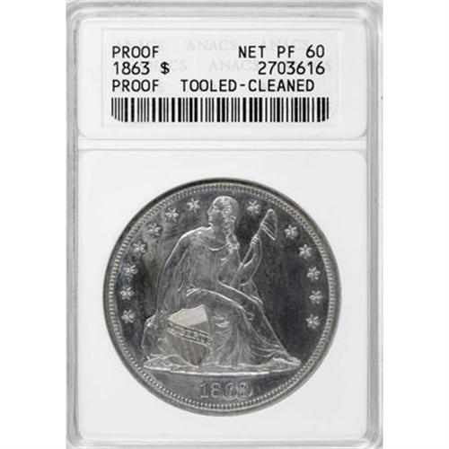 <B>1863 $1 --Tooled, Cleaned--ANACS. Proof, Net PR60.</B></I> Boldly impressed for this Civil War issue, which has a mintage of only 460 proofs. Surprisingly strong eye appeal despite numerous hairlines in the fields and evidence of tooling near the eagle's head.<BR><BR><B>Coin Engraver:</B> Christian Gobrecht<BR><BR><b>Shipping:</b> Coins & Currency (<a target="_blank" href="http://www.heritageauctions.com/common/shipping.php">view shipping information</a>)