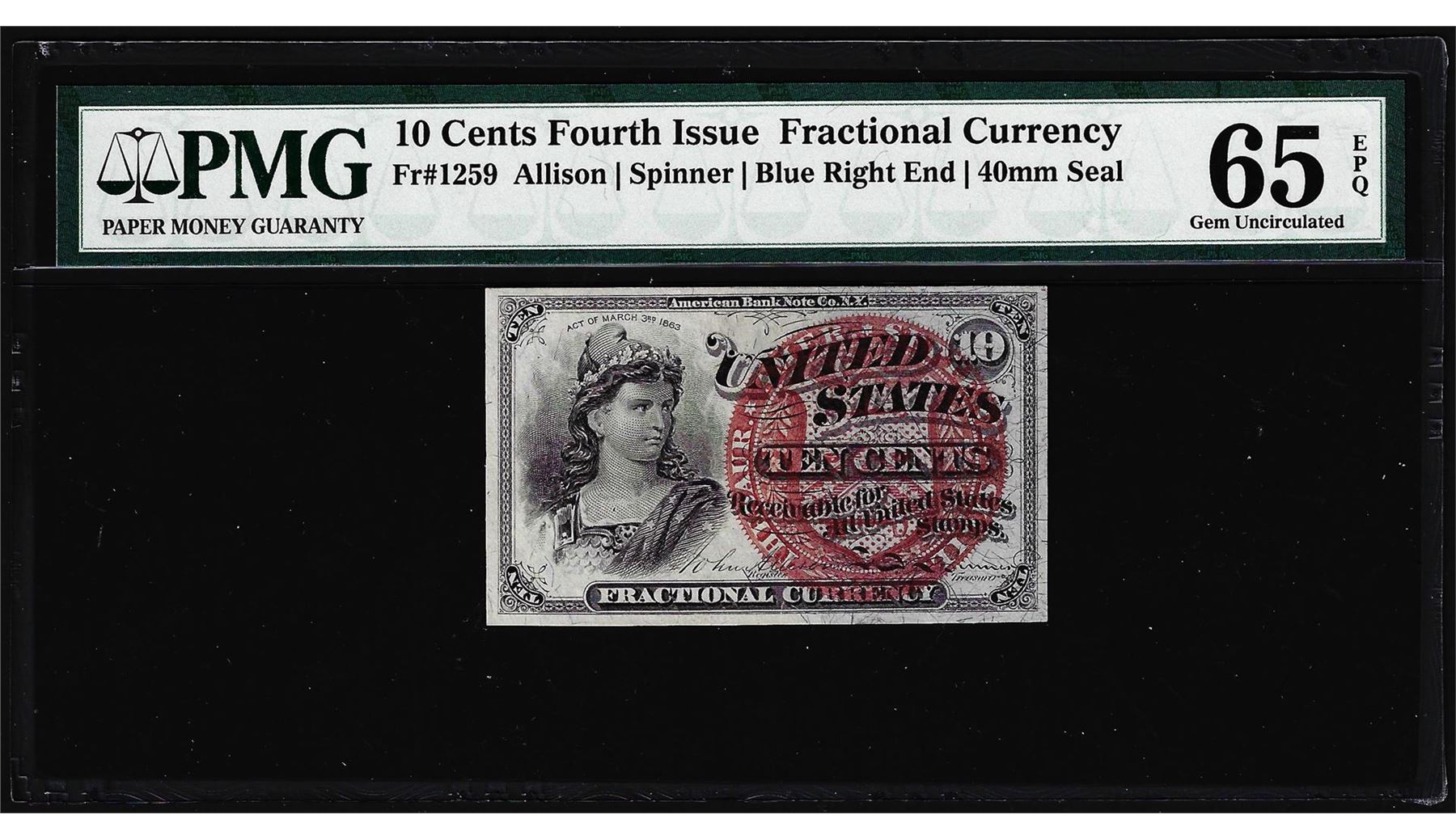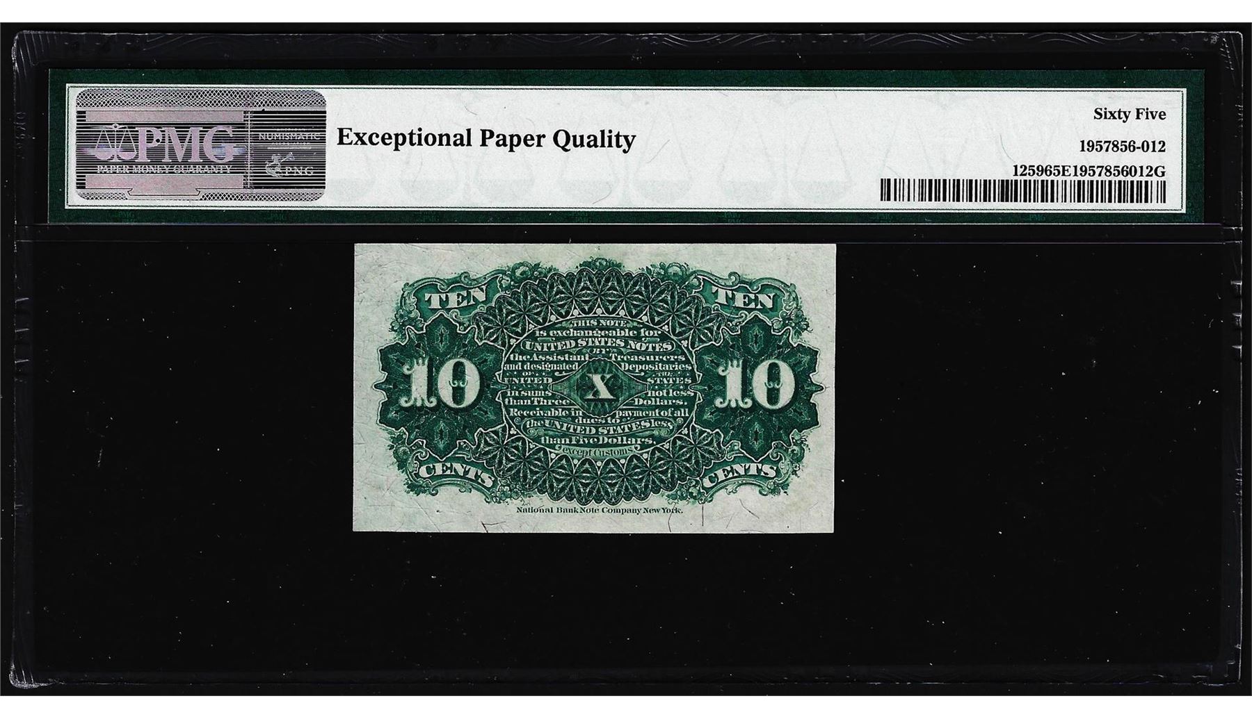 One 1863 10 Cent 4th Issue Fractional Currency Note Fr.1259 PMG Choice Uncirculated 65EPQ. PMG Certified.