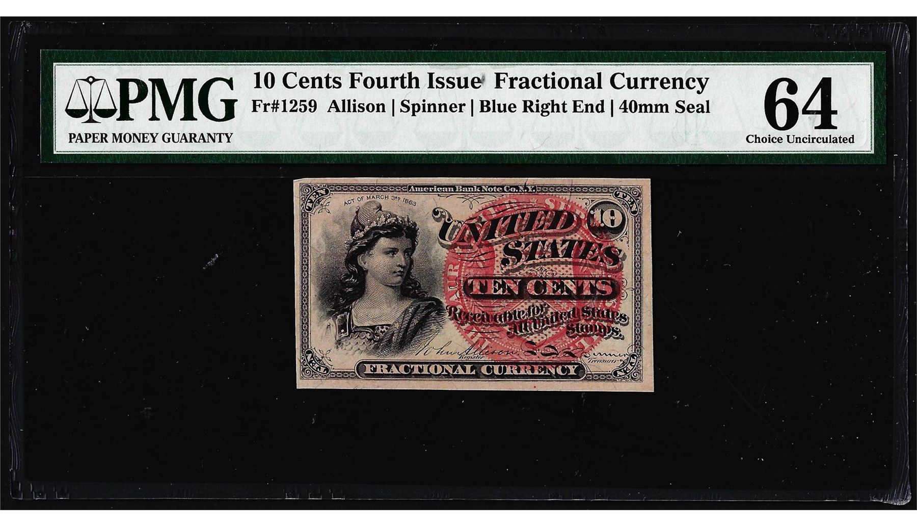 One 1863 10 Cent Fourth Issue Fractional Currency Note Fr.1259 PMG Choice Uncirculated 64. PMG Certified.
