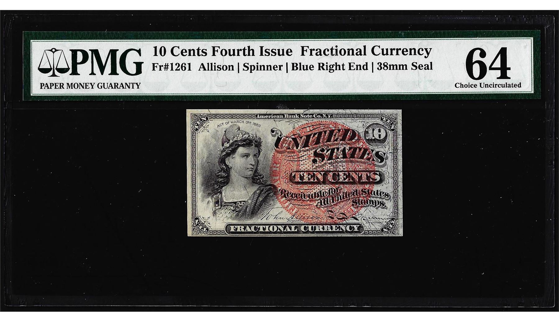 One 1863 10 Cent Fourth Issue Fractional Currency Note Fr.1261 PMG Choice Uncirculated 64. PMG Certified.