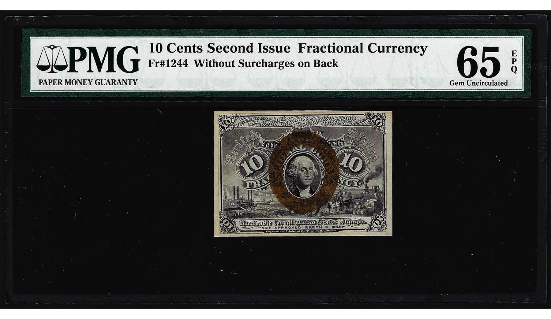 One 1863 10 Cent Second Issue Fractional Currency Note Fr.1244 PMG Ch. Uncirculated 65EPQ. PMG Certified.