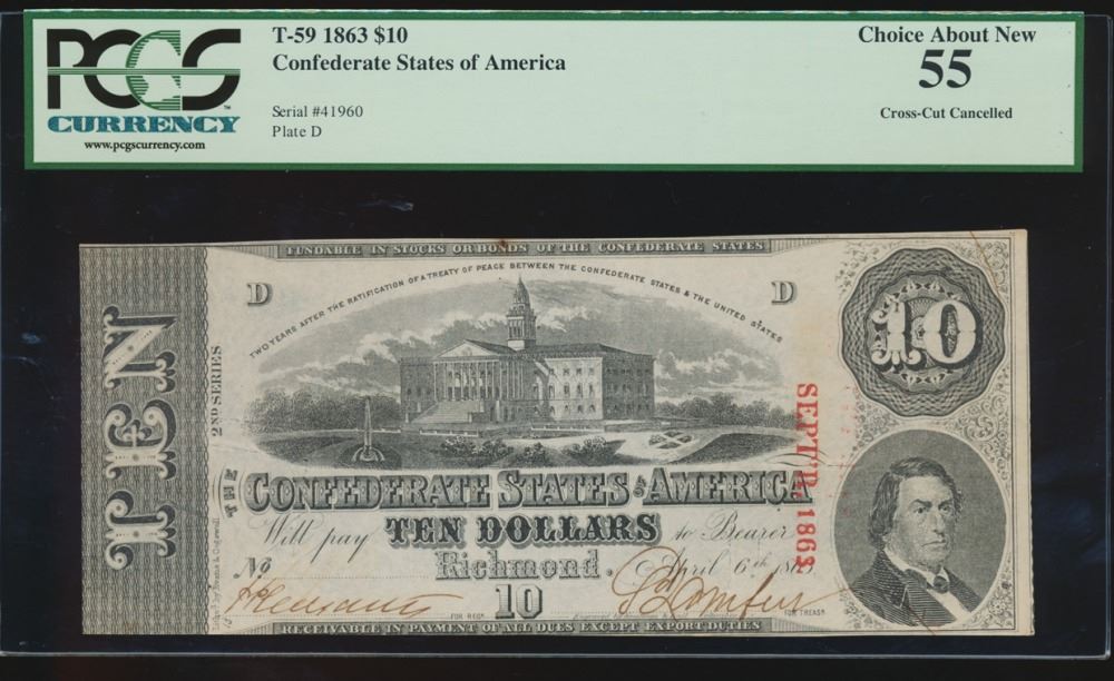 One 1863 $10 Confederate States of America Note PCGS 55 Cross Cut Cancelled.