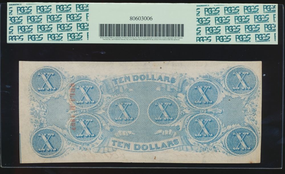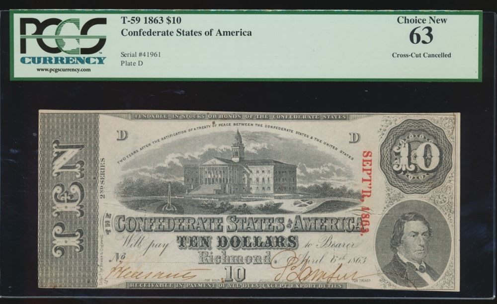 One 1863 $10 Confederate States of America Note PCGS 63.