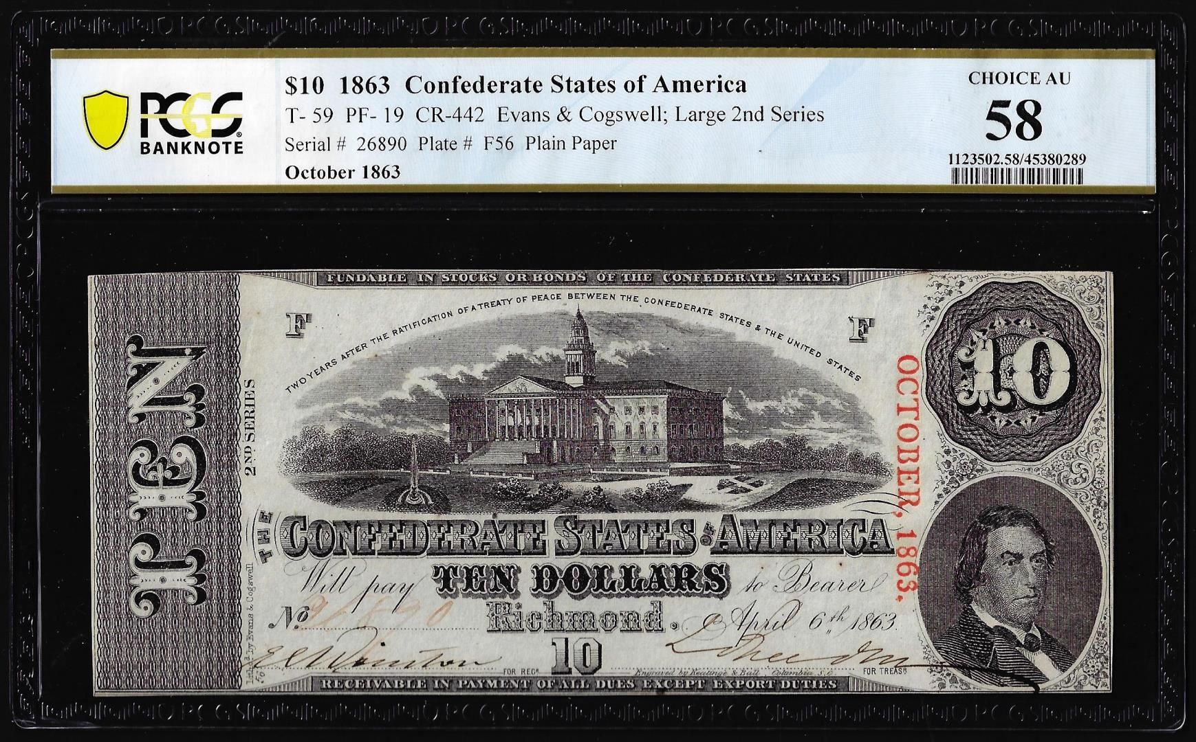 1863 $10 Confederate States of America Note T-59 PCGS Choice About Uncirculated 58