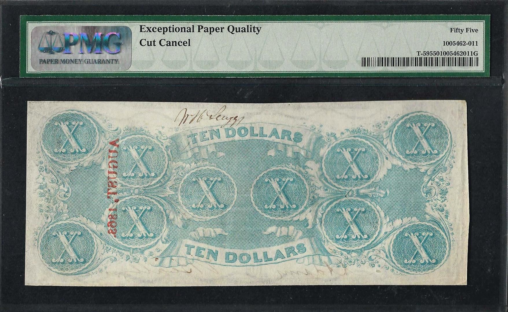 One 1863 $10 Confederate States of America Note T-59 PMG About Uncirculated 55EPQ Canceled. PMG Certified.