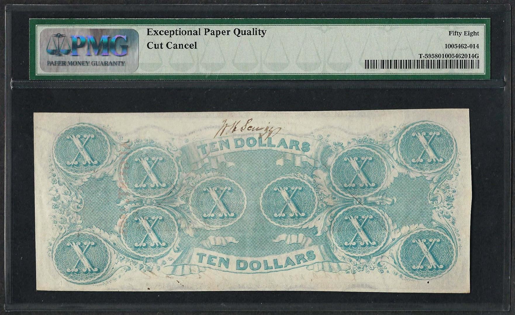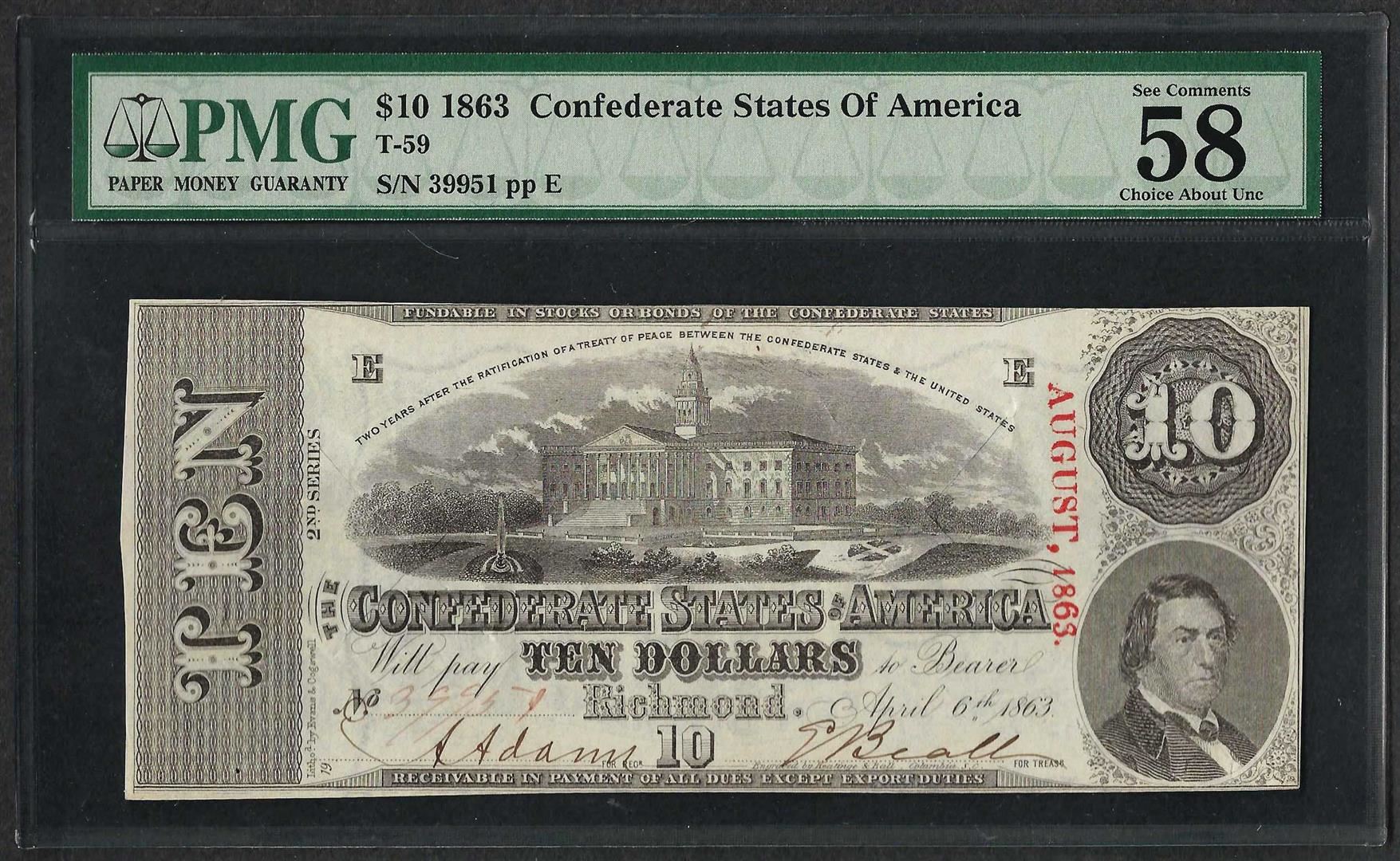 1863 $10 Confederate States of America Note T-59 PMG About Uncirculated 58EPQ Ca