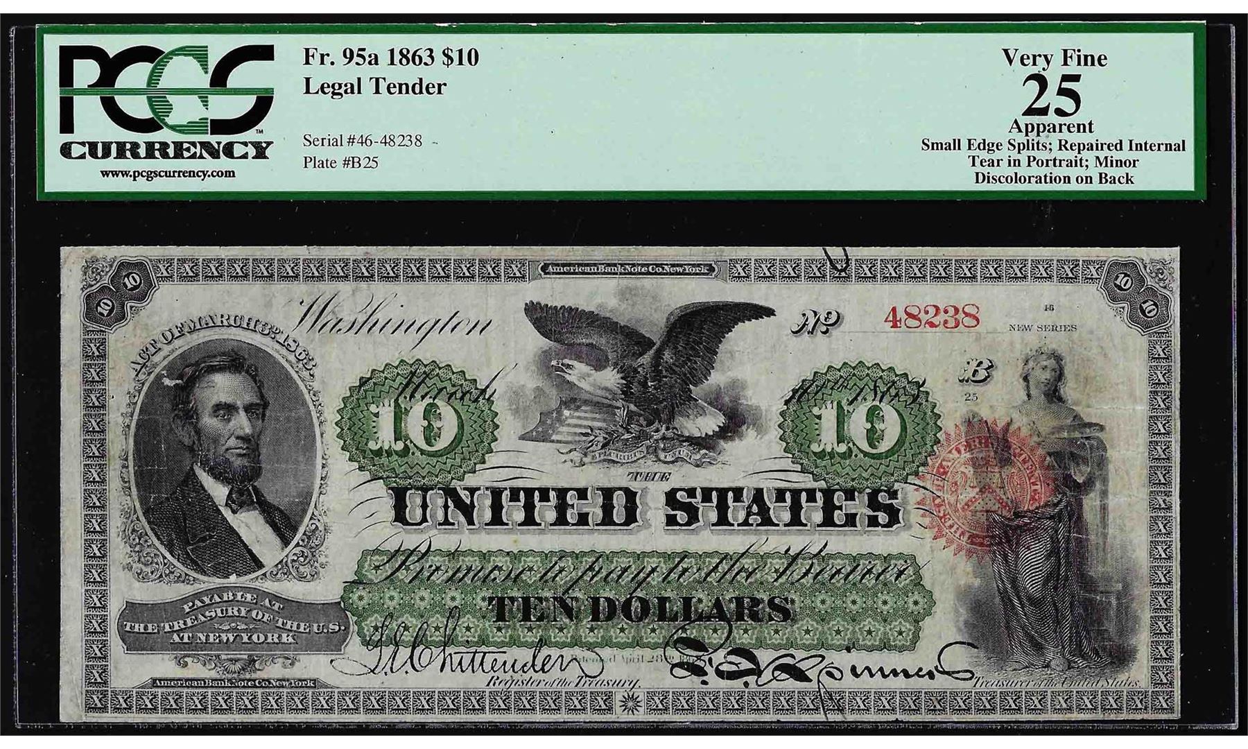 One 1863 $10 Legal Tender Note Fr.95a PCGS Very Fine 25 Apparent. PCGS Graded.