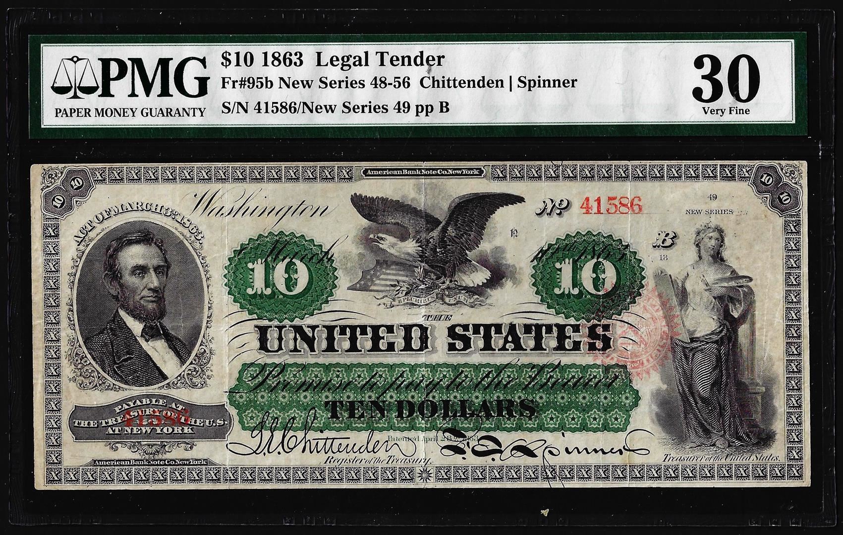 One 1863 $10 Legal Tender Note Fr.95b PMG Very Fine 30. PMG Certified.