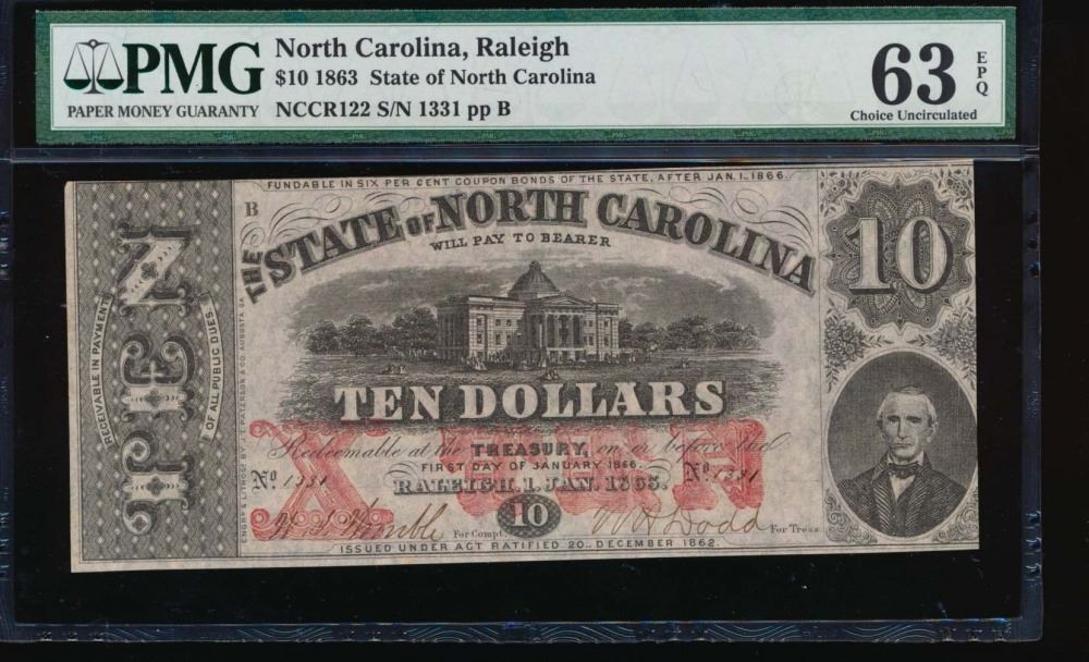 One 1863 $10 North Carolina Obsolete Note PMG 63EPQ.