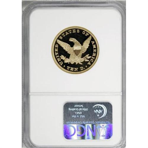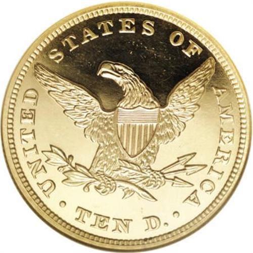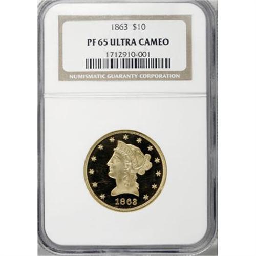 <B>1863 $10 PR65 Ultra Cameo NGC.</B></I> Highly brilliant yellow gold surfaces and amazing contrast create a stunning beauty with extraordinary aesthetic appeal. The fields are watery and deeply mirrored, surrounding creamy yellow-gold luster on the obverse and reverse design motifs. The surfaces are virtually flawless, with only the slightest contact marks, primarily limited to the reverse. Only two or three pedigree characteristics are evident: a minuscule spot between two dentils over star 8, a tiny stain confined to the outer rim at star 13, and a minute contact mark in the upper reverse field, midway between E of STATES and the eagle's head.<BR><BR><B>Rarity and Population Data</B></I><BR>Just nine or ten proof 1863 eagles exist today from an original mintage of 30 coins, according to our study of past collection and sale records. NGC and PCGS show a combined total population of 25 grading events, suggesting a resubmission rate of 2.5 submissions per coin.<BR><BR><B>Grade PCGS NGC</B></I><BR>PR63 3 0<BR>PR63 Cameo 0 1<BR>PR64 4 0<BR>PR64 Cameo 0 5<BR>PR64 Deep Cameo 4 5<BR>PR65 Deep Cameo 1 1<BR>PR66 Deep Cameo 0 1<BR><BR><B>Die Details</B></I><BR>In his <I>Proof Encyclopedia</B></I>, Breen describes the dies:<BR><BR> Date low, far to right, much nearer to 13th star than to first, the partly filled 3 nearly lined up with right corner of truncation. Scattered rust pits on cheek and neck. Left base of 1 central. Reverse, top of second stripe thin.<BR><BR> To that description, we can add that the obverse has a small build up of extra metal on the rim at star 12. The cheek has swirls of raised die lines between the earlobe and nose. The right-most pale of gule 6 extends upward to the third crossbar, but no others extend past the bottom crossbar. The reverse die, especially, was expertly prepared.<BR><BR><B>Roster of Existing 1863 Proof Eagles</B></I><BR> 1. PR66 Ultra Cameo NGC. Appears on the NGC Census, but not otherwise known to us.<BR><B> 2. PR65 Ultra Cameo NGC. The Present Specimen.</B></I> 1978 Grand Central Sale; Auction '79 (Paramount, 7/1979), lot 334; Ed Trompeter Collection (Superior, 3/1992), lot 203, sale not held; Heritage Auction Galleries, privately; unknown private collection.<BR> 3. PR65 Deep Cameo PCGS. Hollinbeck Coin Co. (6/1953); Norweb Collection (Bowers and Merena, 3/1988), lot 2187; Bowers and Merena (11/1989), lot 555; Superior (2/1991), lot 2860; Superior (8/1991), lot 778; Heritage (7/2005), lot 10383; Heritage (1/2007), lot 3658.<BR> 4. PR64 Deep Cameo. Smithsonian Institution.<BR> 5. PR64 Cameo NGC. J. Colvin Randall (4/1897); Clapp Collection (1942); Louis E. Eliasberg, Sr.; Eliasberg Estate (Bowers and Ruddy, 10/1982), lot 718; Bowers and Merena (9/1989), lot 544; RARCOA (Auction '90, 8/1990), lot 964; Superior (2/1991), lot 2861.<BR> 6. PR64 PCGS. Samuel Wolfson (Stack's, 10/1962), lot 685; Abner Kreisberg (11/1970), lot 1846; Harry W. Bass, Jr. (Bowers and Merena, 10/1999), lot 1490; Heritage (5/2000), lot 7795.<BR> 7. PR64 PCGS. Heritage (9/2005), lot 4872.<BR> <B>8</B></I>. PR63 PCGS. W. Foster Ely; W. Elliot Woodward (9/5/1883); Garrett Collection (Stack's, 3/1976), lot 405; New England (6/1981), lot 1111; Bowers and Merena (9/2001), lot 295.<B><BR> </B></I>9. Proof. Amon Carter Collection (Stack's, 1/1984), lot 764. Possibly ex Frederick Geiss (B. Max Mehl, 2/1947), lot 1890.<BR> 10. Proof. American Numismatic Society.<BR><BR> A. PR63 PCGS. Kingswood (6/1997), lot 184. Catalog not available.<BR> B. Proof. Thomas Melish (Abe Kosoff, 4/1956), lot 2451; A.M. Kagin. Possibly ex Menjou Collection (Numismatic Gallery, 6/1950), lot 1604. Not illustrated.<BR> C. Proof. F.C.C. Boyd; World's Greatest Collection (Numismatic Gallery, 1/1946), lot 668; Memorable Collection (Numismatic Gallery, 3/1948), lot 561. Not illustrated in either catalog.<BR> D. XF. Davis-Graves (Stack's, 4/1954), lot 943. Not illustrated. The catalog description states: "Can be called Extremely fine. Has some of the proof luster. A rare date." This catalog description tells us little, not even if it is a proof. This listing should probably be discounted.<BR><BR><b>Shipping:</b> Coins & Currency (<a target="_blank" href="http://www.heritageauctions.com/common/shipping.php">view shipping information</a>)