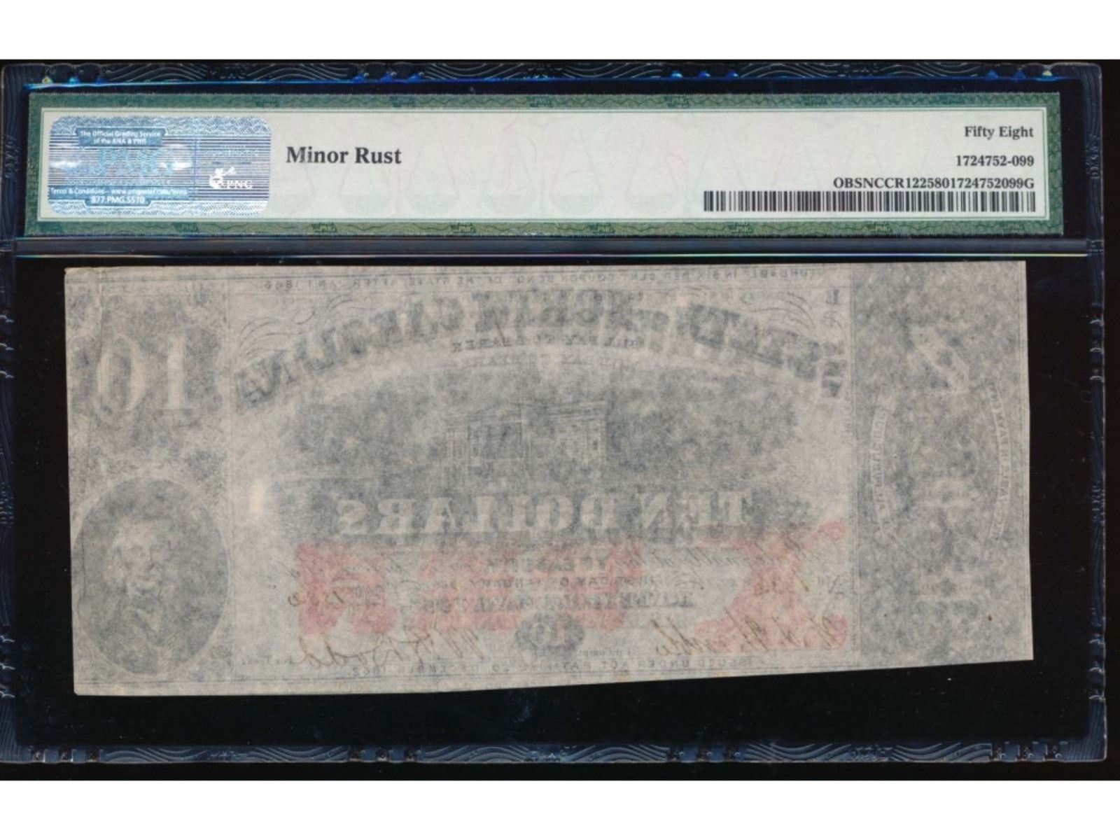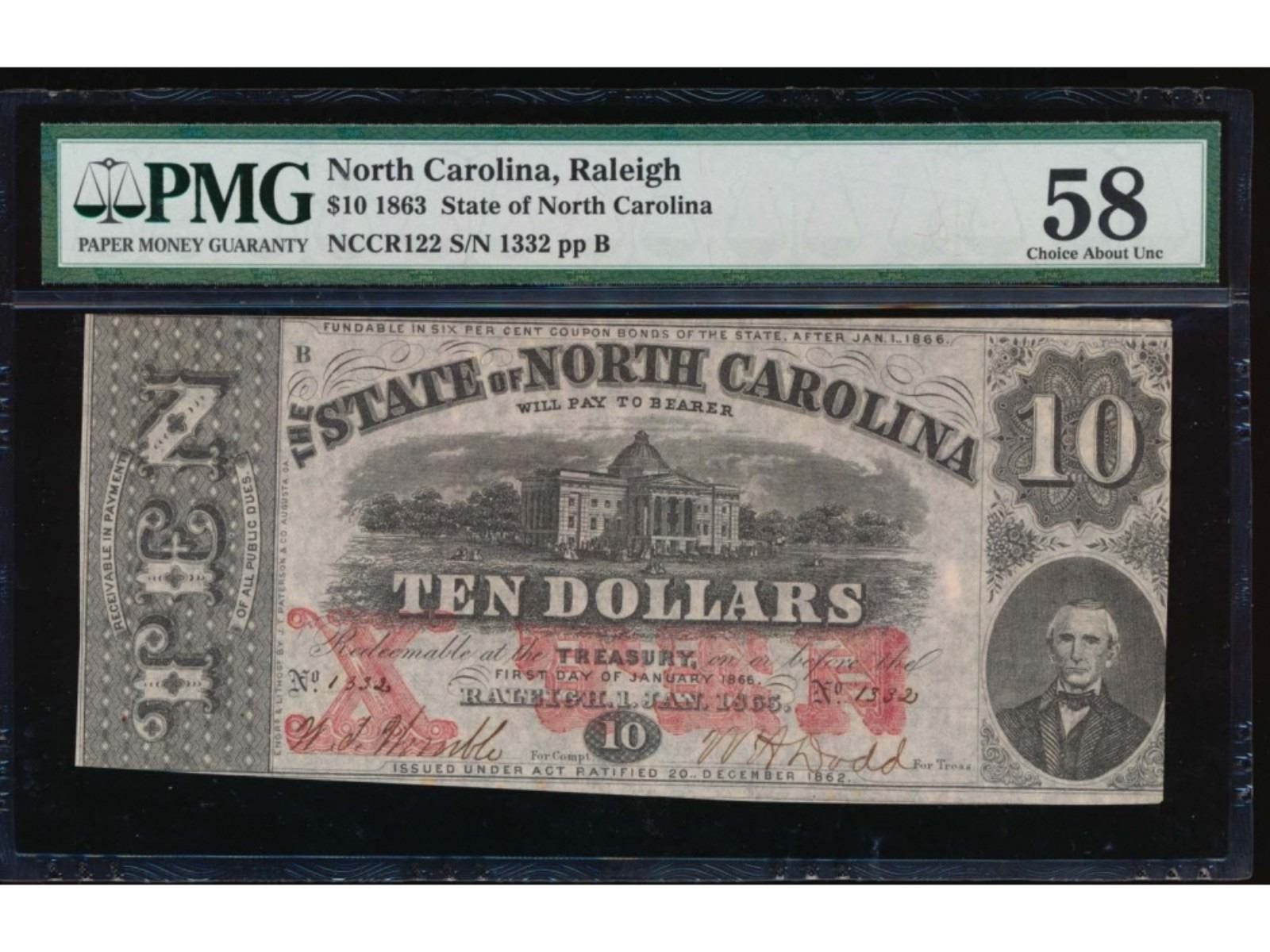 One 1863 $10 State of North Carolina Obsolete Note PMG 58.