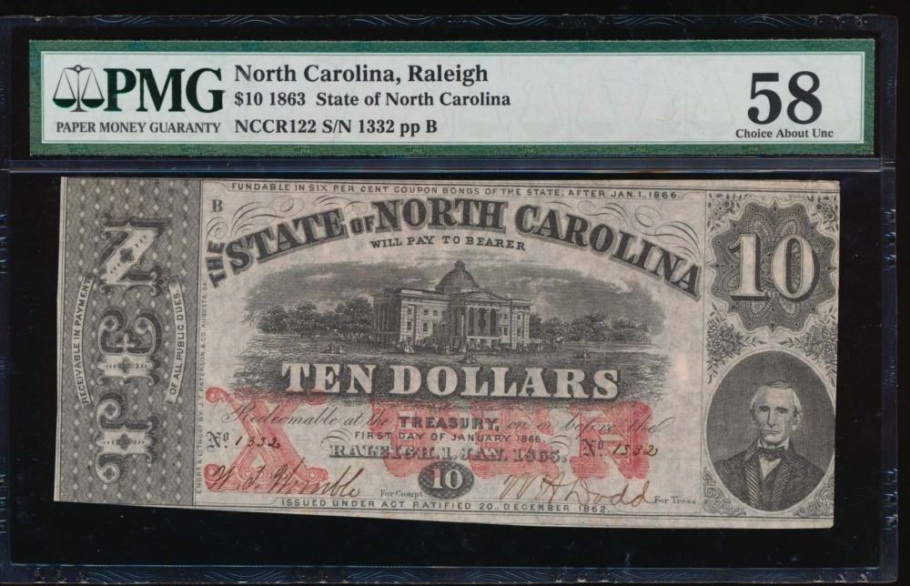 One 1863 $10 State of North Carolina Obsolete Note PMG 58.