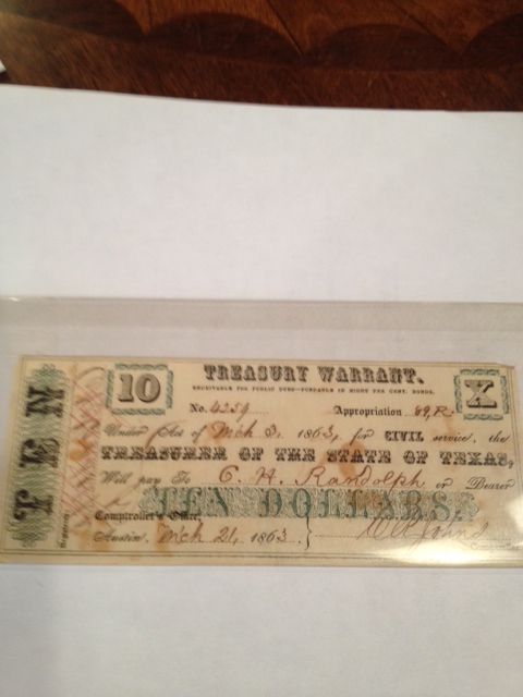 1863 $10 TREASURY WARRANT CIVIL SERVICE