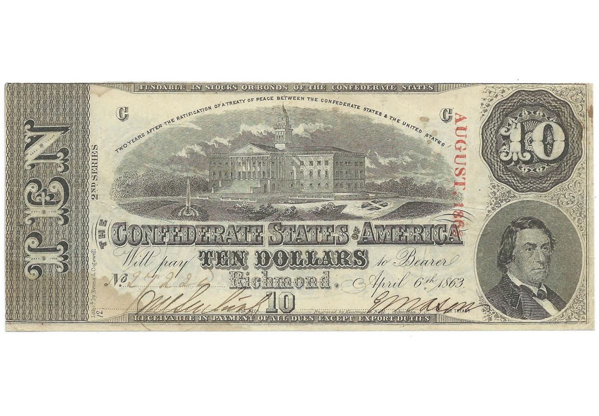 One 1863 $10 The Confederate States of America Note T-59 CC