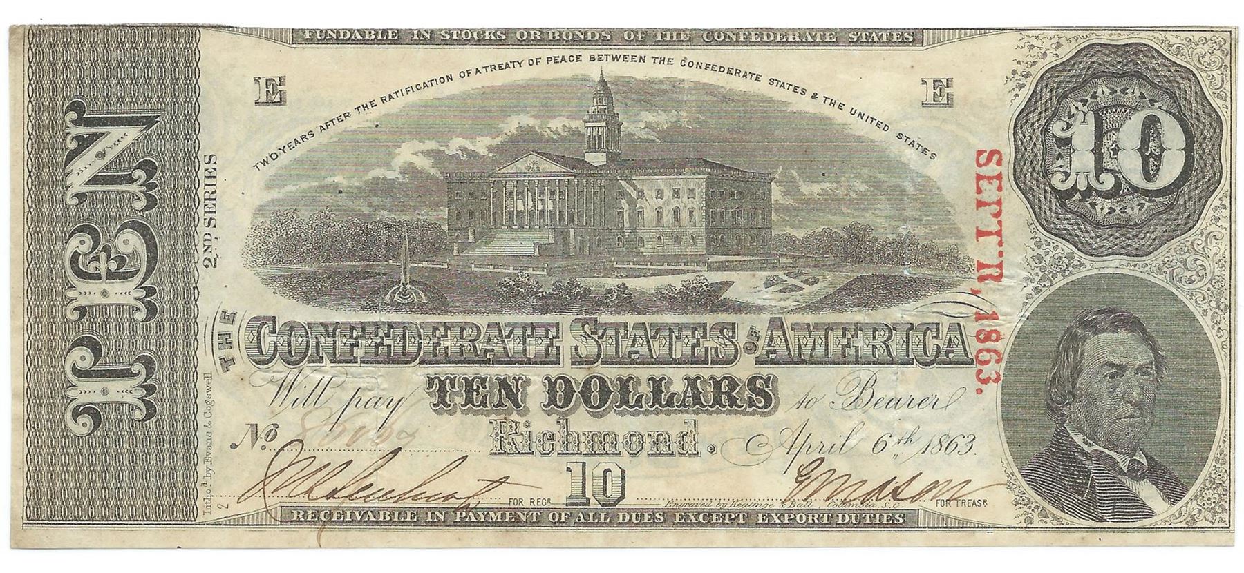 One 1863 $10 The Confederate States of America Note T-59 CC