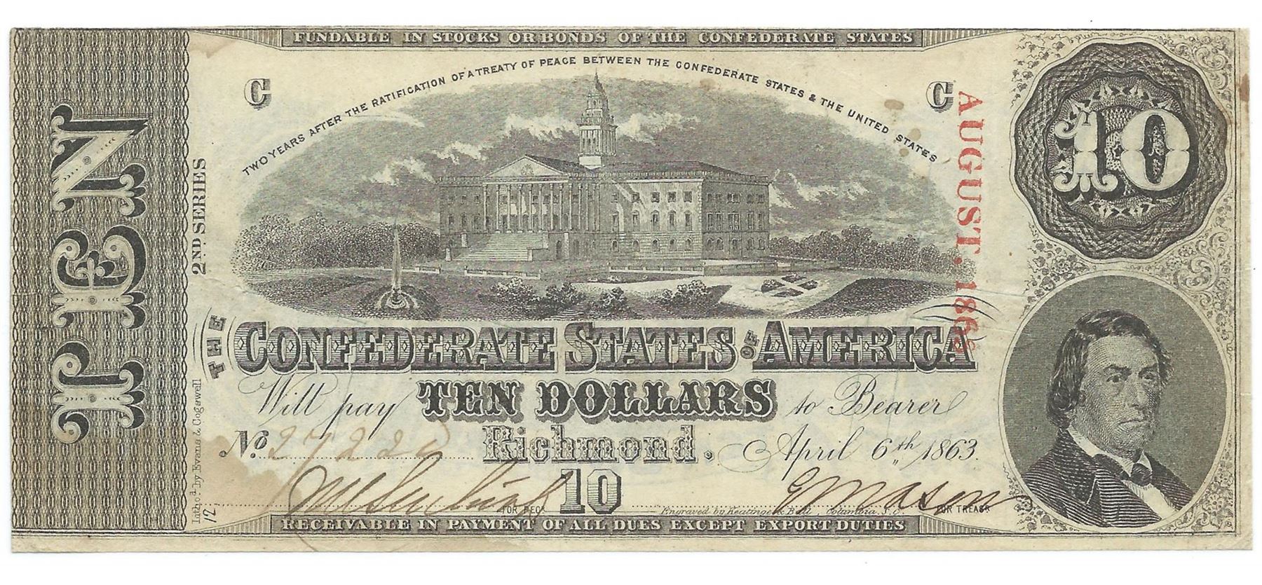One 1863 $10 The Confederate States of America Note T-59 CC