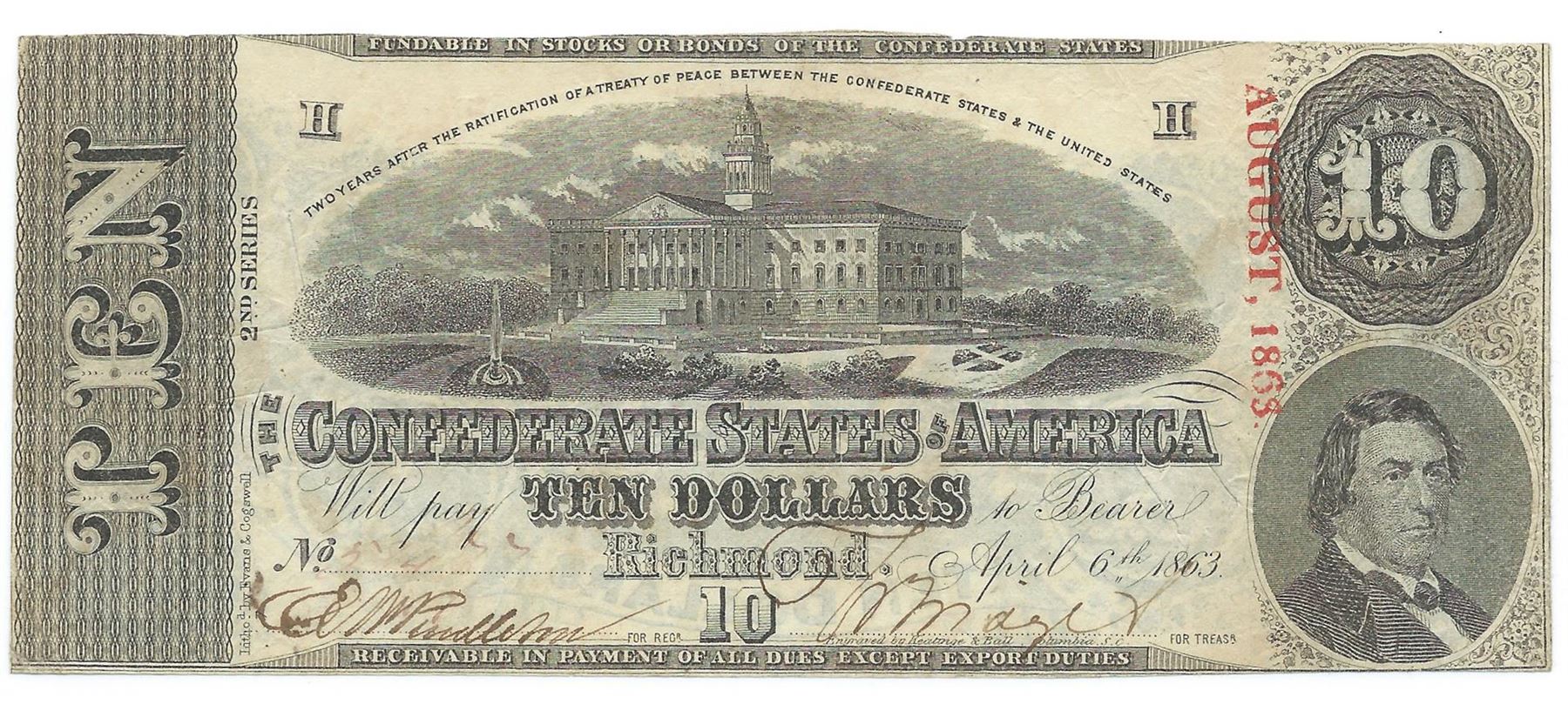 One 1863 $10 The Confederate States of America Note T-59 CC