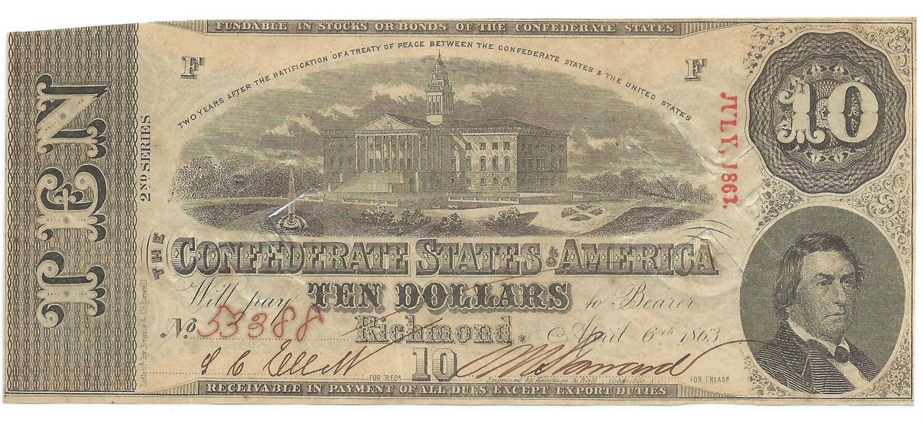 One 1863 $10 The Confederate States of America Note T-59 CC