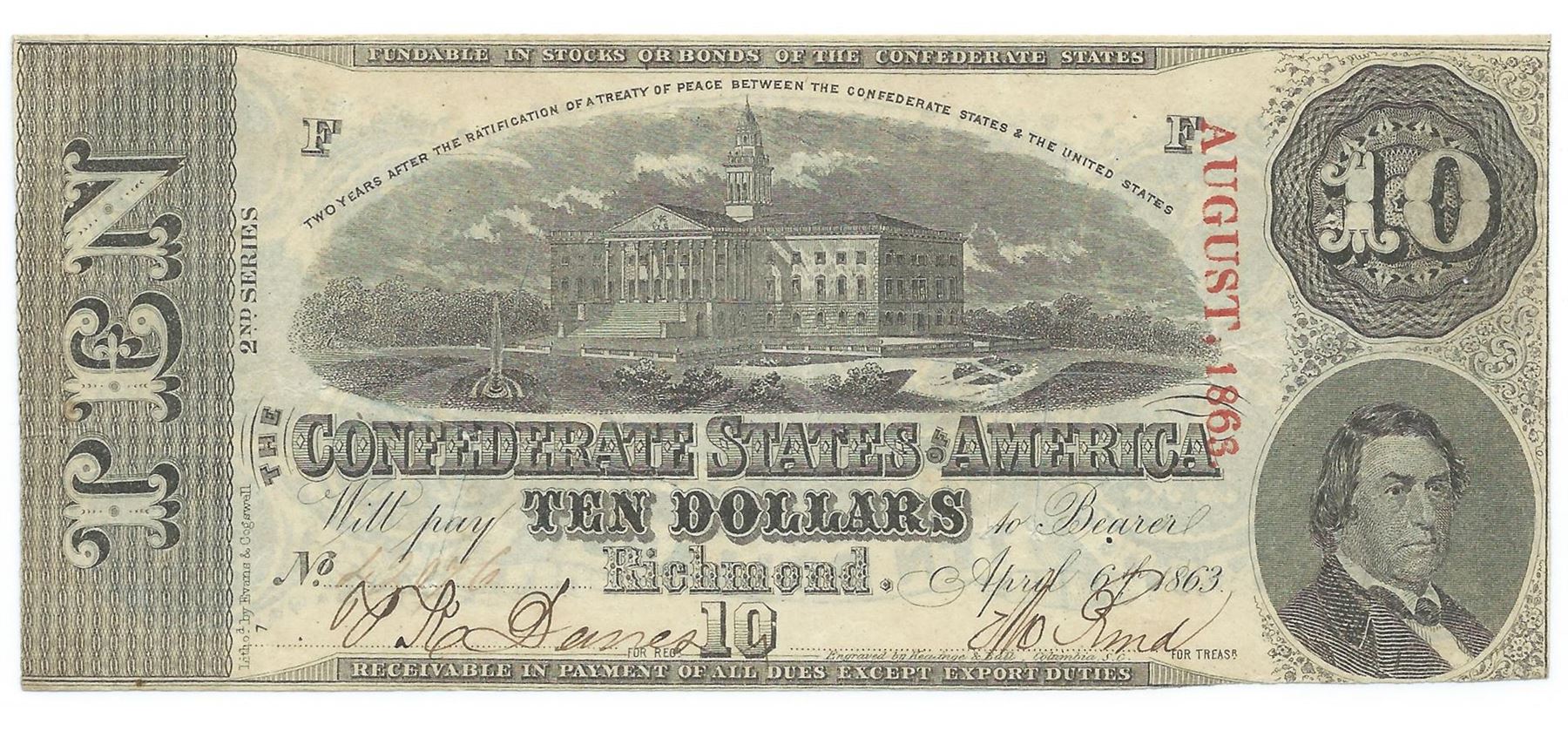 One 1863 $10 The Confederate States of America Note T-59 CC