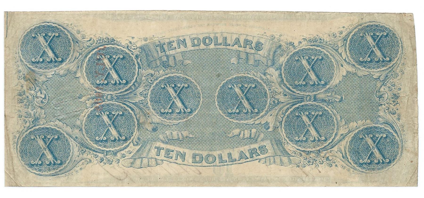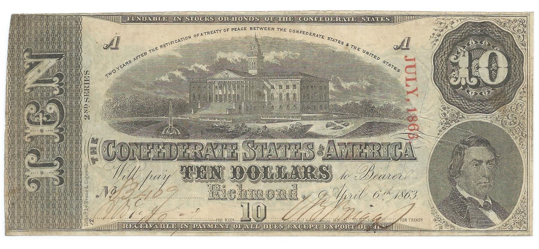 One 1863 $10 The Confederate States of America Note T-59 CC