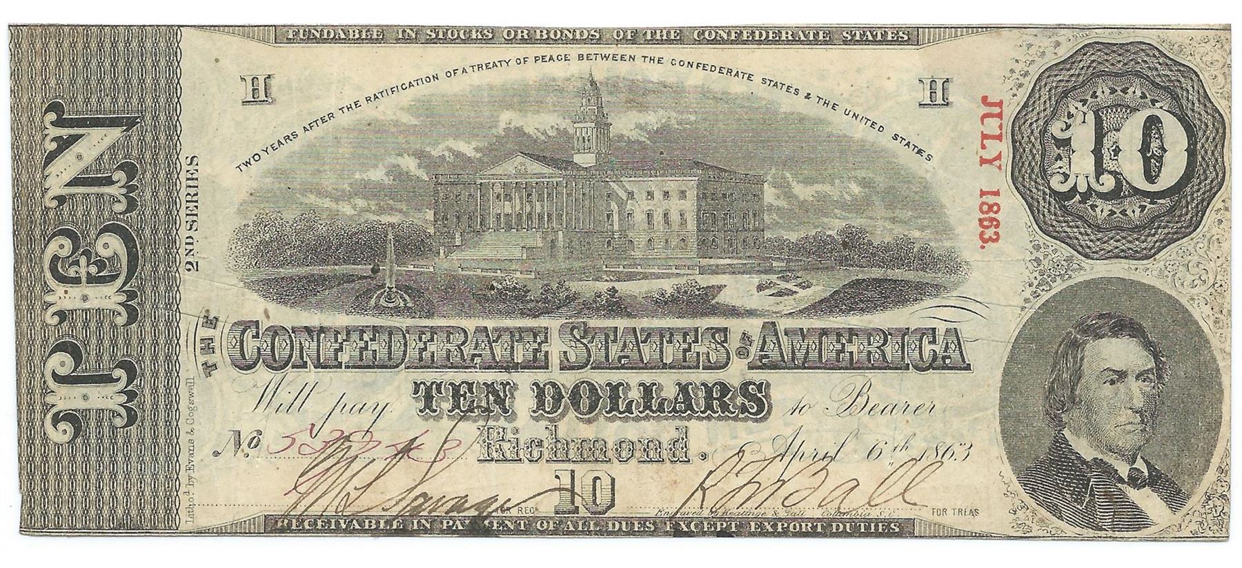 One 1863 $10 The Confederate States of America Note T-59 CC
