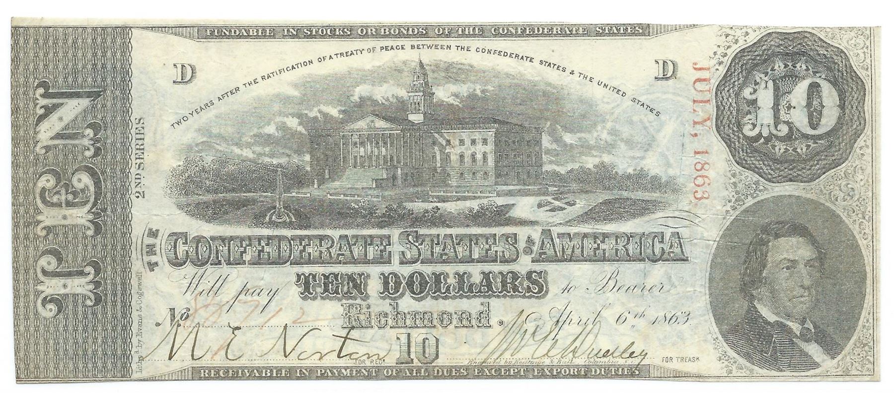 One 1863 $10 The Confederate States of America Note T-59 CC