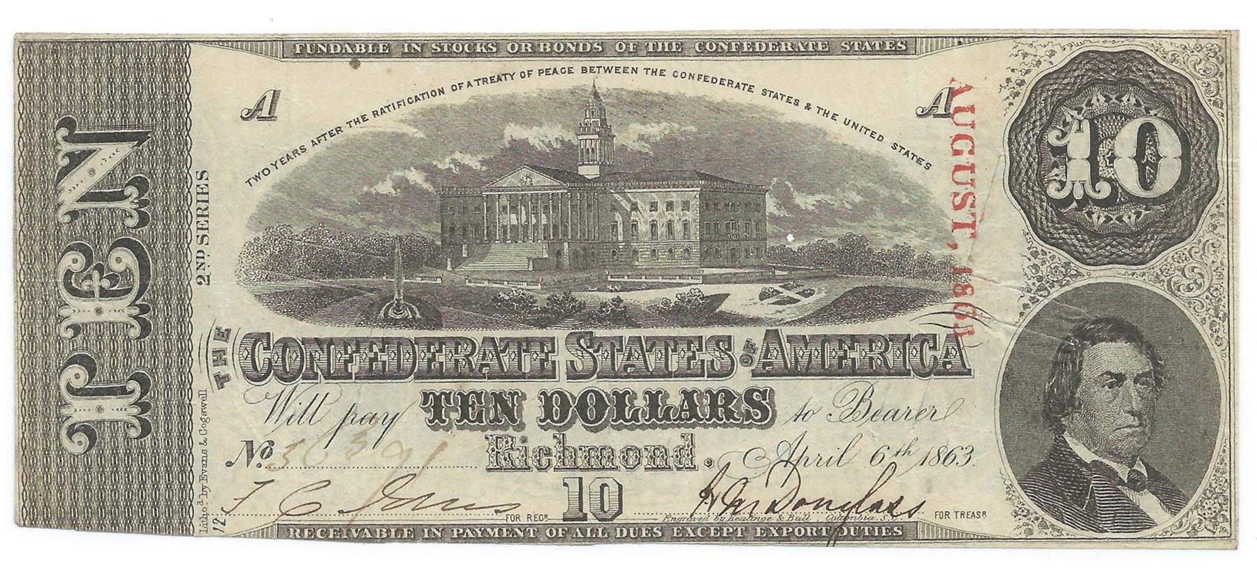 One 1863 $10 The Confederate States of America Note T-59 CC