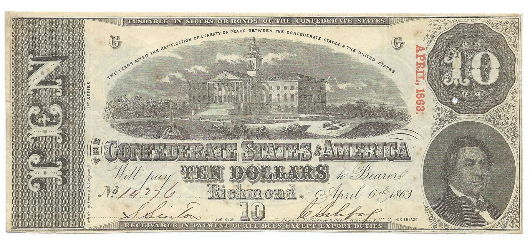 One 1863 $10 The Confederate States of America Note T-59 CC