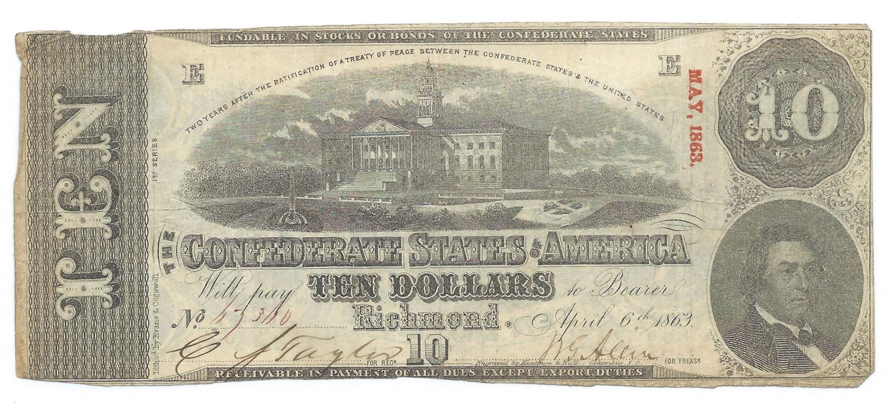One 1863 $10 The Confederate States of America Note T-59 CC