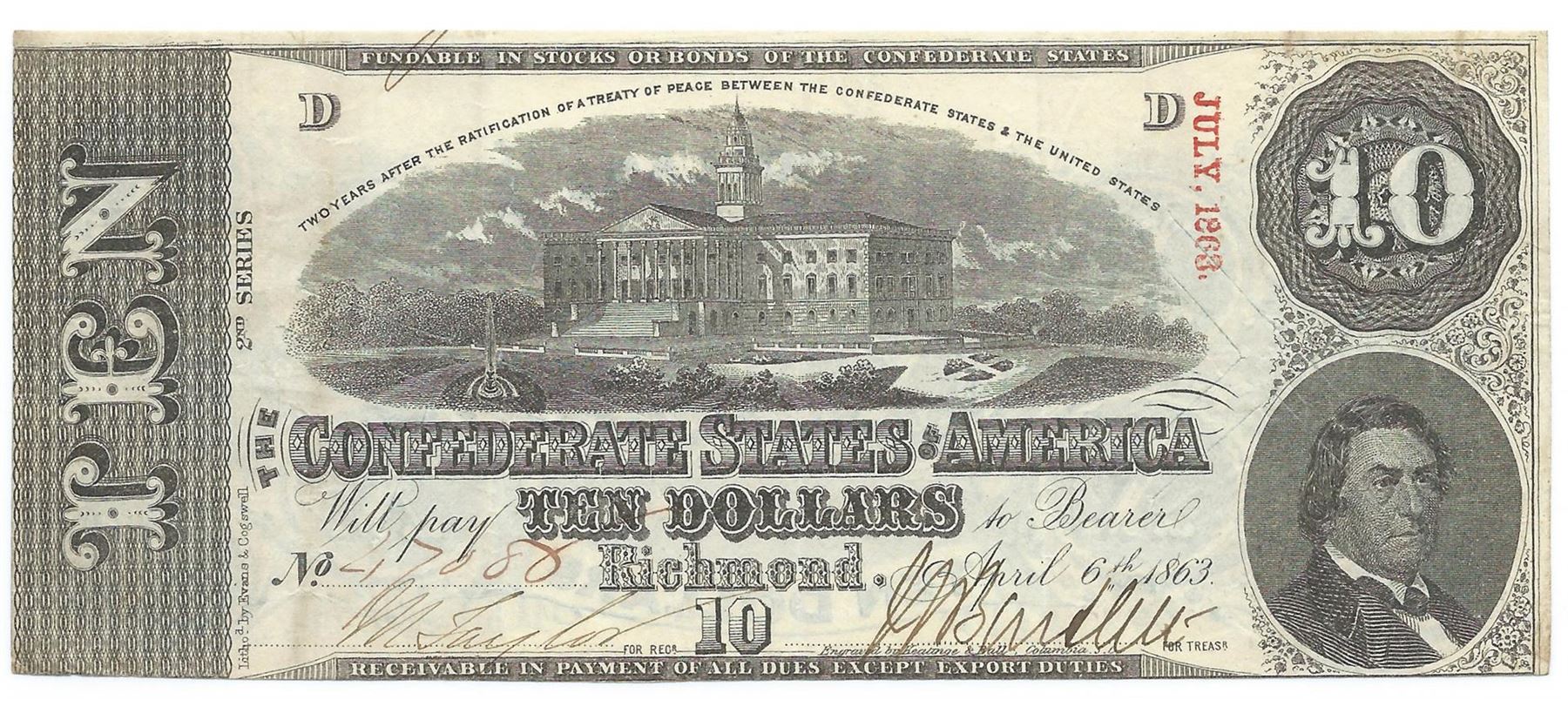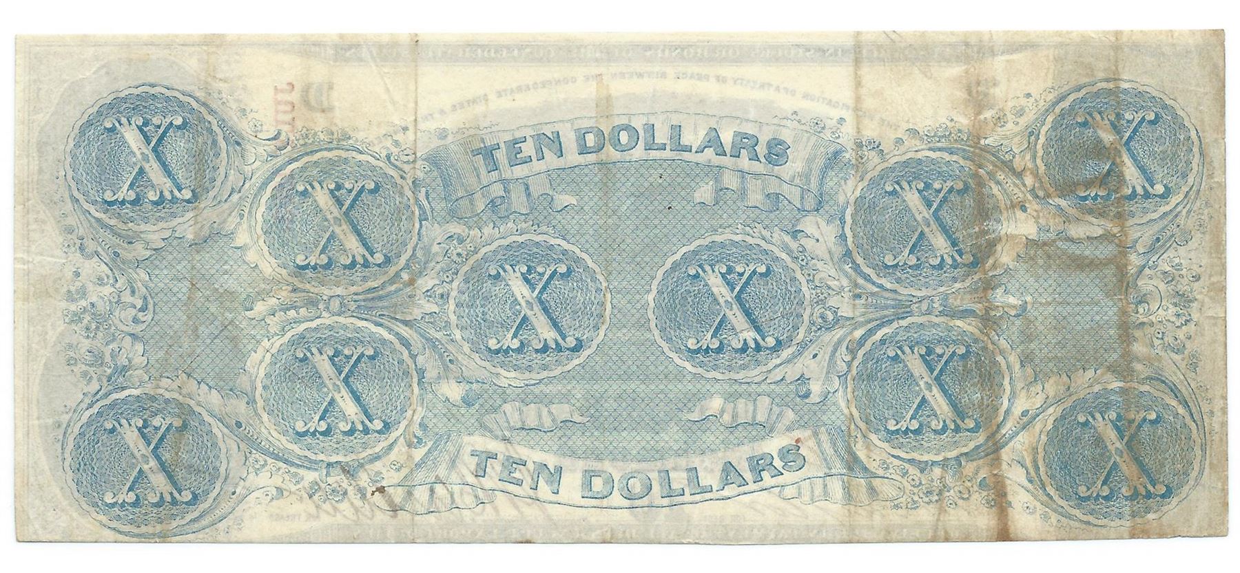 One 1863 $10 The Confederate States of America Note T-59 CC