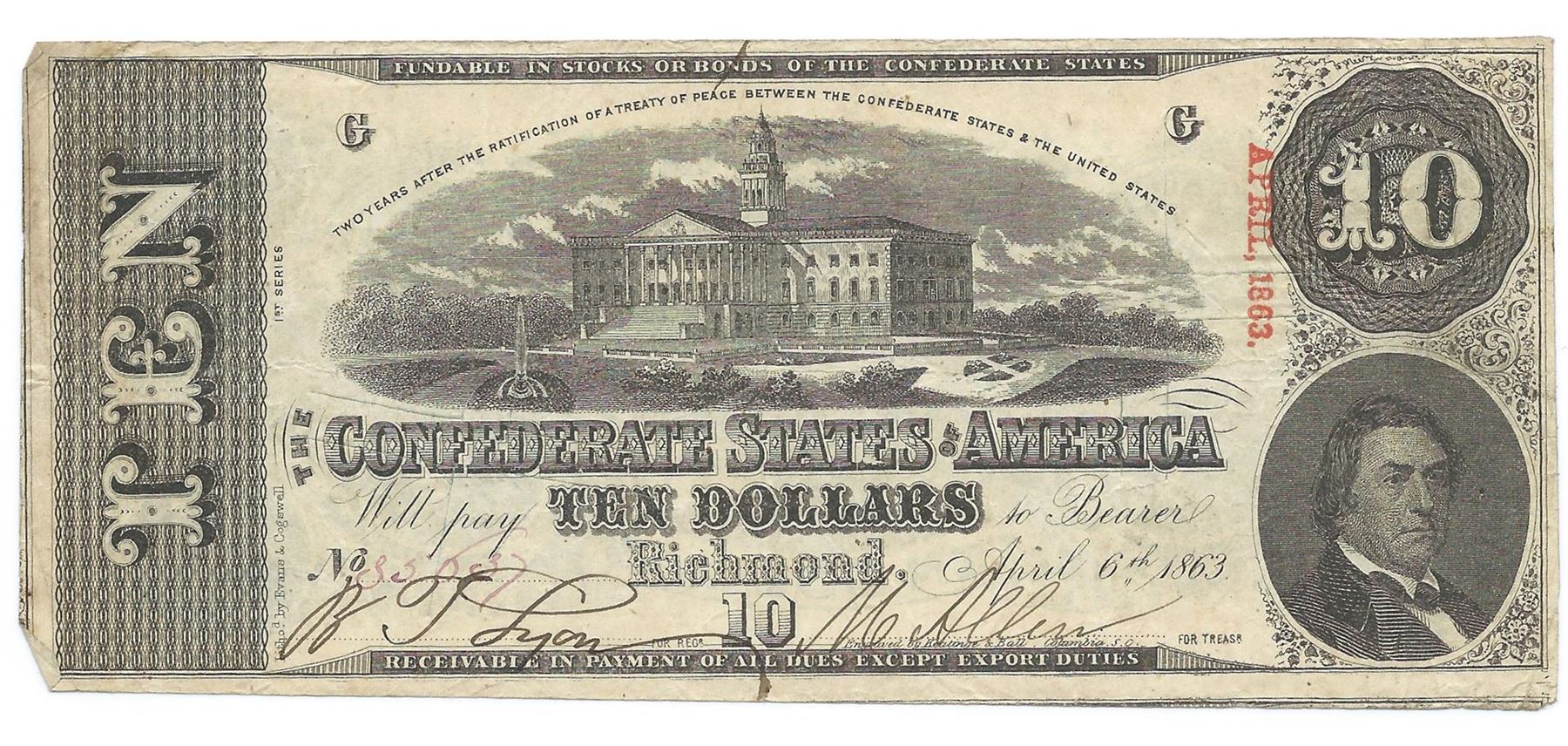 One 1863 $10 The Confederate States of America Note T-59 CC