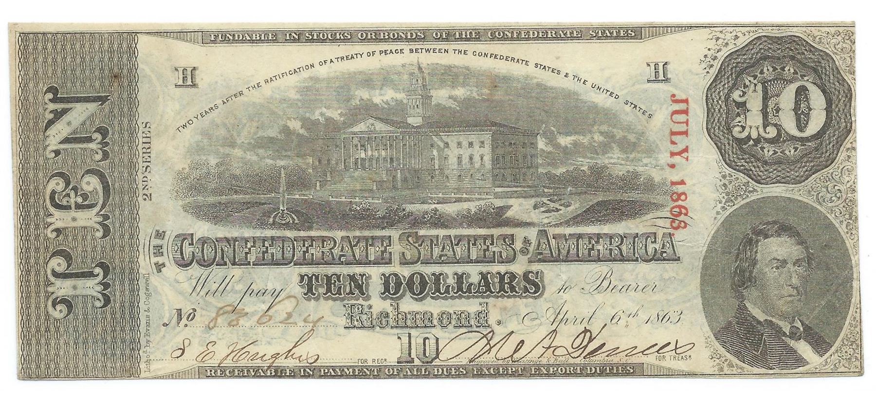 One 1863 $10 The Confederate States of America Note T-59 CC