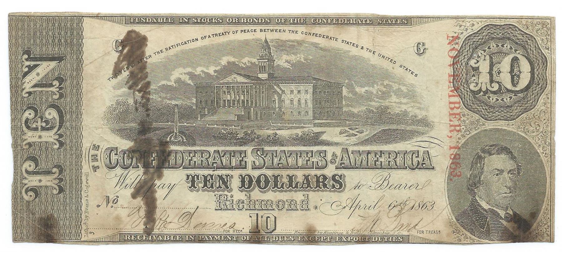 One 1863 $10 The Confederate States of America Note