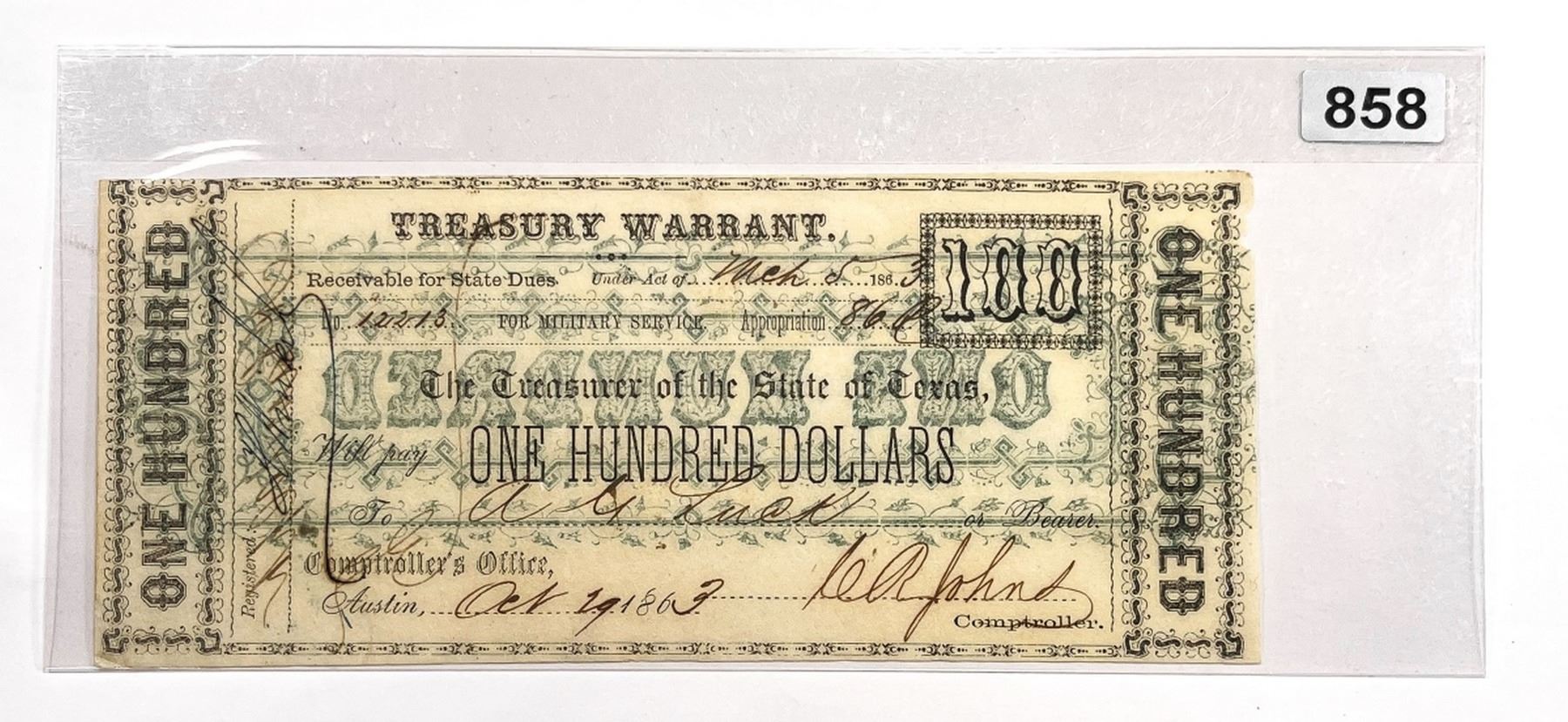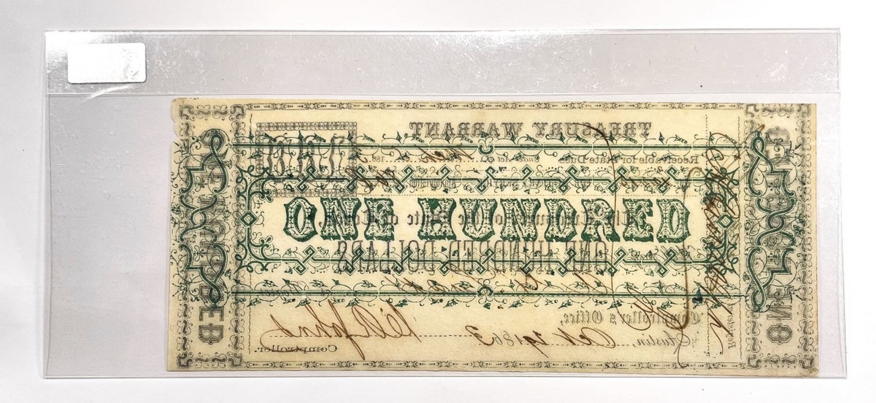 1863 $100 Austin, Texas Treasury Warrant -