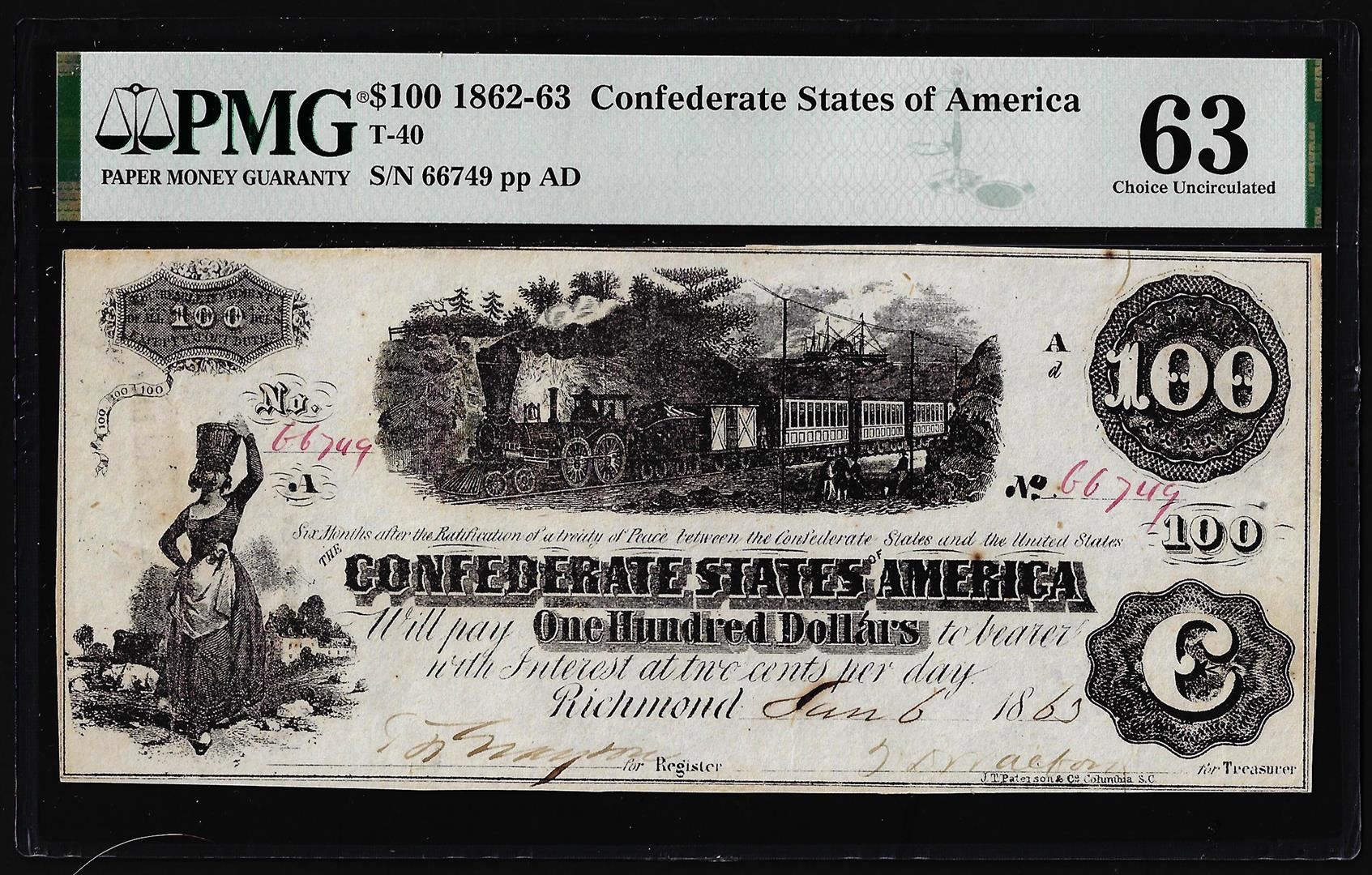 1863 $100 Confederate States of America Note T-40 PMG Choice Uncirculated 63