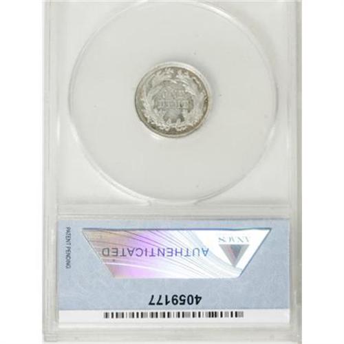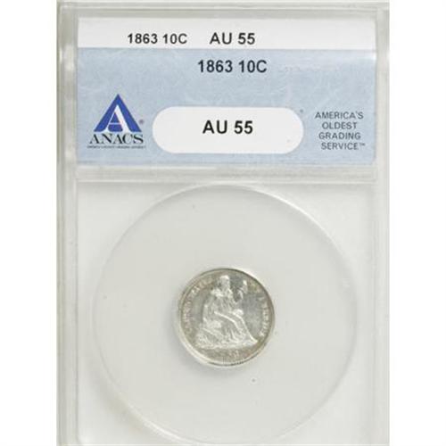 <B>1863 10C AU55 ANACS.</B></I> This low-mintage issue (14,000 business strikes) displays lightly toned, bright surfaces that exhibit well struck design elements. A few minor circulation marks are scattered about. <BR><I>From The John Stimson, Sr. Collection, Part Two.</B></I><BR><BR><B>Coin Engraver:</B> Christian Gobrecht<BR><BR><b>Shipping:</b> Coins & Currency (<a target="_blank" href="http://www.heritageauctions.com/common/shipping.php">view shipping information</a>)