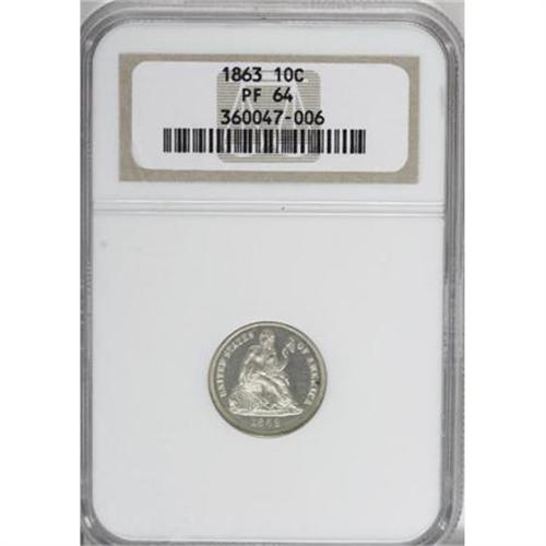 <B>1863 10C PR64 NGC.</B></I> Both sides of this vibrant near-Gem show significant contrast, though a layer of pink-peach toning over the right reverse precludes a Cameo designation. Strongly reflective with a few faint hairlines in the fields. One of just 460 specimens struck. Census: 42 in 64, 44 finer (10/07).<BR><BR><B>Coin Engraver:</B> Christian Gobrecht<BR><BR><b>Shipping:</b> Coins & Currency (<a target="_blank" href="http://www.heritageauctions.com/common/shipping.php">view shipping information</a>)