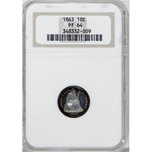 <B>1863 10C PR64 NGC.</B></I> Both sides have a ring of gold-orange patina around untoned centers, while the obverse shows an extra band of blue at the rim. Gleaming and delightful despite the small flaws that preclude Gem status. Census: 42 in 64, 44 finer (10/07).<BR><BR><B>Coin Engraver:</B> Christian Gobrecht<BR><BR><b>Shipping:</b> Coins & Currency (<a target="_blank" href="http://www.heritageauctions.com/common/shipping.php">view shipping information</a>)