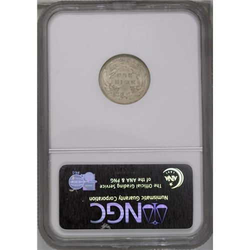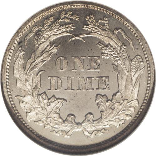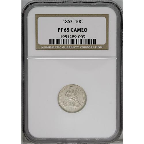 <B>1863<10C> PR65 Cameo NGC.</B></I> Proofs from this Civil War year have long been a favorite of collectors as only 460 pieces were reportedly struck in addition to a scant production of 14,000 business strikes. Both sides of this untoned, noticeably striated specimen boast appreciable contrast and, only under close scrutiny reveal a few carbon flecks on the reverse. Census: 5 in 65 Cameo, 4 finer (3/06).
