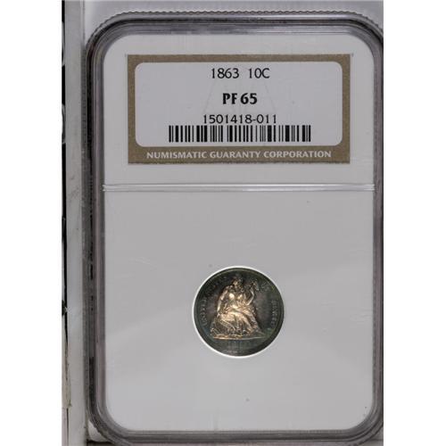 <B>1863<10C> PR65 NGC.</B></I> Iridescent cobalt-blue, lavender, and beige-gold patina bathes each side of this lovely Civil War proof. Razor-sharp definition characterizes the mildly frosted design elements, which contrast with moderately reflective fields. A trivial mark is concealed in Liberty's hair.
