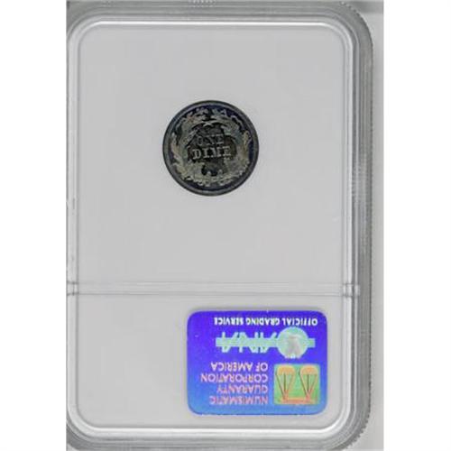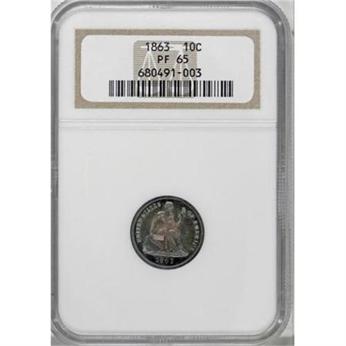 <B>1863 10C PR65 NGC.</B></I> Gleaming and sharply struck with vivid sea-green patina at the margins that fades to ocean-blue and rose at the centers. A small planchet flaw appears near Liberty's left (facing) shoulder, but the overall preservation is excellent. Census: 14 in 65, 30 finer (10/07).<BR><BR><B>Coin Engraver:</B> Christian Gobrecht<BR><BR><b>Shipping:</b> Coins & Currency (<a target="_blank" href="http://www.heritageauctions.com/common/shipping.php">view shipping information</a>)
