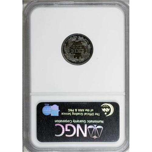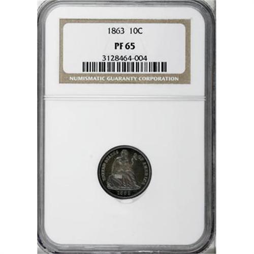 <B>1863 10C PR65 NGC.</B></I> Whispers of cobalt-blue and violet dance over both sides of this Gem proof, each of which displays a degree of field-motif contrast. Exquisitely struck, and devoid of significant marks.<BR><BR><B>Coin Engraver:</B> Christian Gobrecht<BR><BR><b>Shipping:</b> Coins & Currency (<a target="_blank" href="http://www.heritageauctions.com/common/shipping.php">view shipping information</a>)