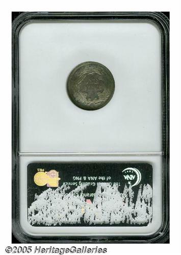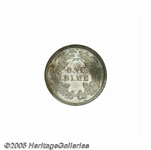 <B>1863<10C> PR67 NGC.</B></I> One of only 460 proofs, the 1863 Dimes have the lowest proof mintage of all Legend dimes. Few specimens have apparently survived at the grade level of the piece offered here. NGC has certified only two other PR67 coins, and two pieces grading higher; PCGS has seen no 1863 Proofs above the PR66 level (6/05). The present coin is sharply struck, with golden-gray centers accented by cobalt-blue and lilac colors around the peripheries, especially on the obverse. The design elements are sharply struck throughout, and offer a moderate contrast with the partially prooflike fields. The surfaces are seemingly devoid of mentionable marks.